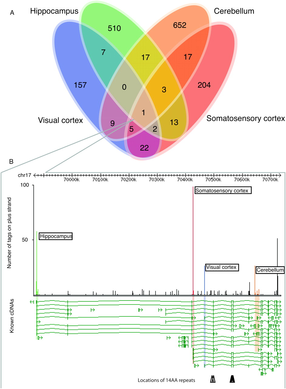 Alternative promoters preferentially expressed in different brain tissues. (A) The Venn diagram shows the number of genes having at least one preferentially expressed promoter (PEP) from any of the four sampled brain tissues, or any combination PEPs of the four tissues. For example, there are 15 genes that have at least one hippocampus PEP and one cerebellum PEP. (B) The Dlgap1 gene has four PEPs, one from each brain tissue. All of these are overlapping known 5′-ends inferred by cDNAs. There are five 14-amino-acid-long repeats in the N-terminal end of the corresponding protein that affects the ability to interact with other proteins. Repeats are indicated as triangles. Note that the cerebellum PEP is downstream from these and will give a protein that lacks these repeats.