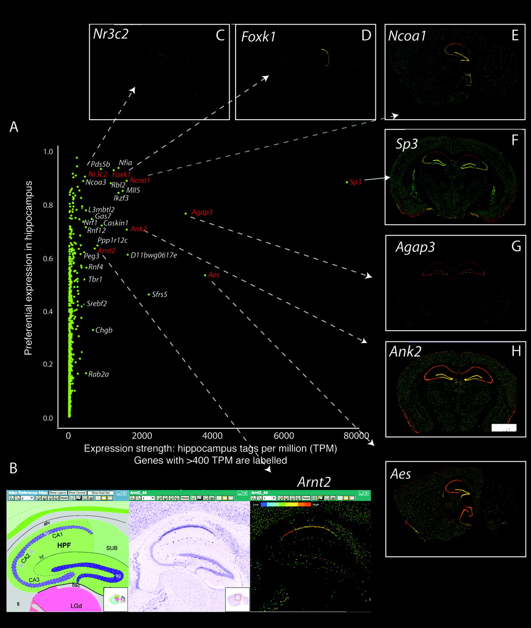 Transcription factor genes with preferential expression in hippocampus. (A) The relation between expression strength (number of hippocampus CAGE tags/million) vs. the “tissue specificity” (fraction of hippocampus tags vs. all brain tags, normalized for library size) of all known transcription factor genes. Note that only a few transcription factor genes are both highly expressed in and highly specific for hippocampus. For example, both in situ hybridization and CAGE data show that the Nr3c2 gene (the mineralocorticoid receptor) is not highly expressed in brain, but almost exclusively expressed in hippocampus, while the Aes gene is expressed in the whole brain with a preference for hippocampus. (C-H and Aes, right) In situ images for some of these factors. (B) In situ hybridization images (Lein et al. 2007) showing the hippocampus expression of the Arnt2 gene. The three images show the Allen reference atlas, the ISH in situ image, and corresponding expression heatmaps.