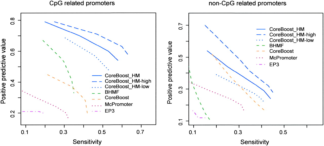 Positive predictive values (PPV) versus sensitivity for CpG-related and non-CpG-related promoters. The prediction results within 500 bp are clustered for each program. Only a prediction locating within 50 bp of the annotated TSS is regarded as a true-positive hit. The blue dashed and blue dotted lines indicate CoreBoost_HM performance on the promoters of highly expressed genes and low express genes, respectively.