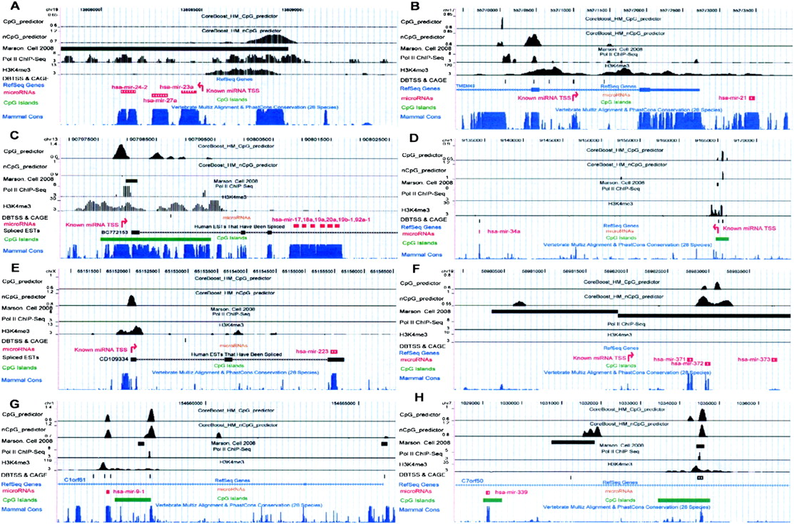 (A–F) CoreBoost_HM perform well on the known intergenic miRNA core-promoters. (G,H) CoreBoost_HM search suggests that some of the intronic miRNA genes may have their own promoters that are independent from the annotated promoters of their host genes. The third (top) track in each subplot shows the predictions given by Marson et al. (2008).