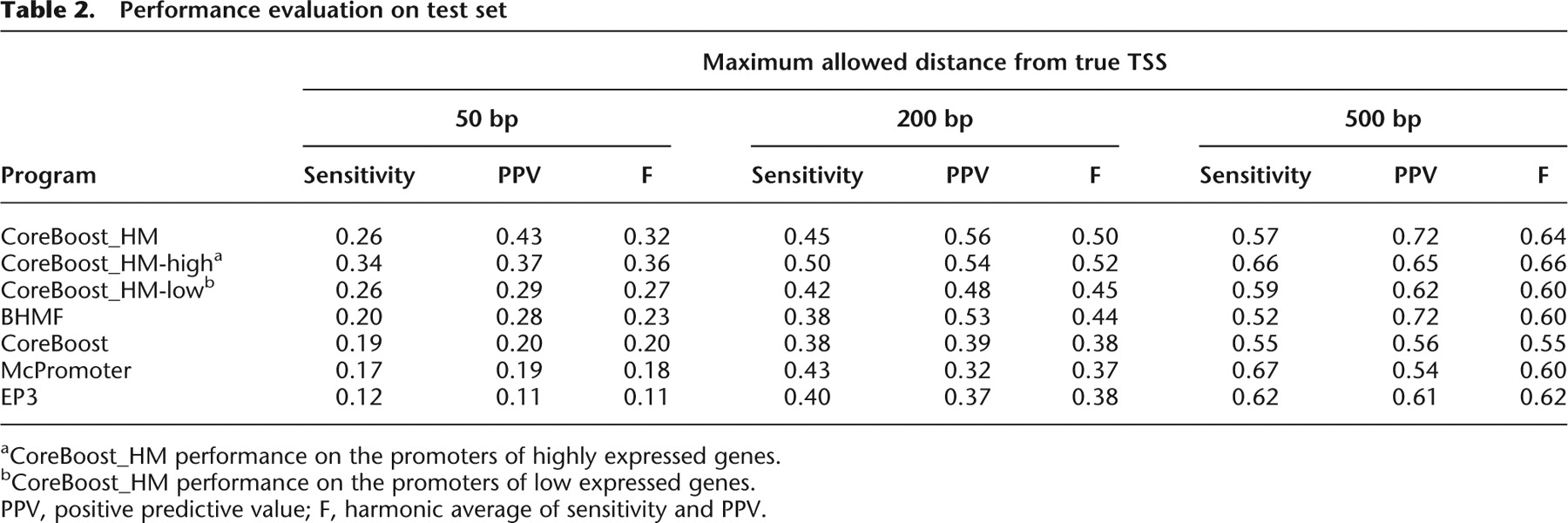 bCoreBoost_HM performance on the promoters of low expressed genes.