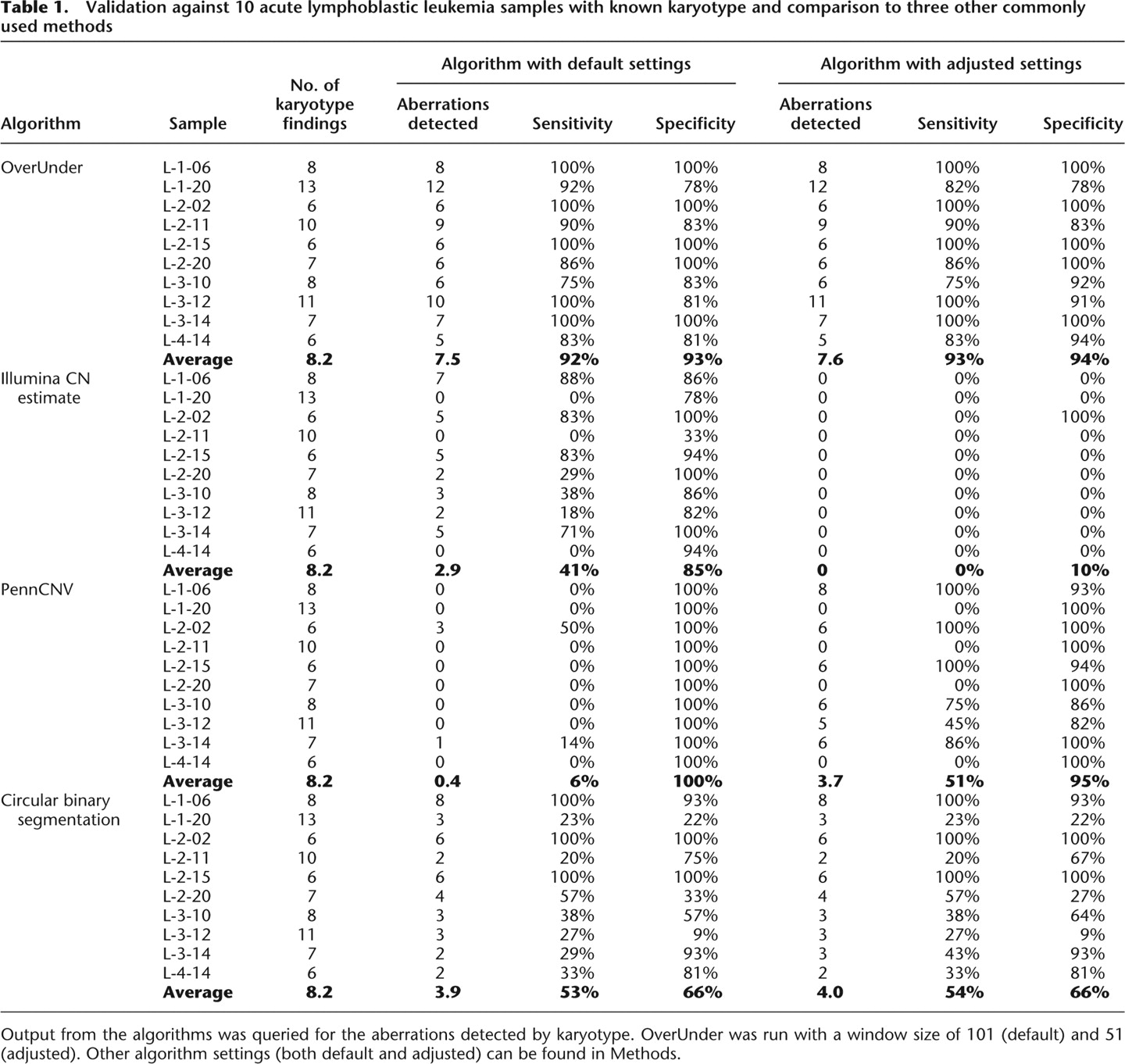 Output from the algorithms was queried for the aberrations detected by karyotype. OverUnder was run with a window size of 101 (default) and 51 (adjusted). Other algorithm settings (both default and adjusted) can be found in Methods.