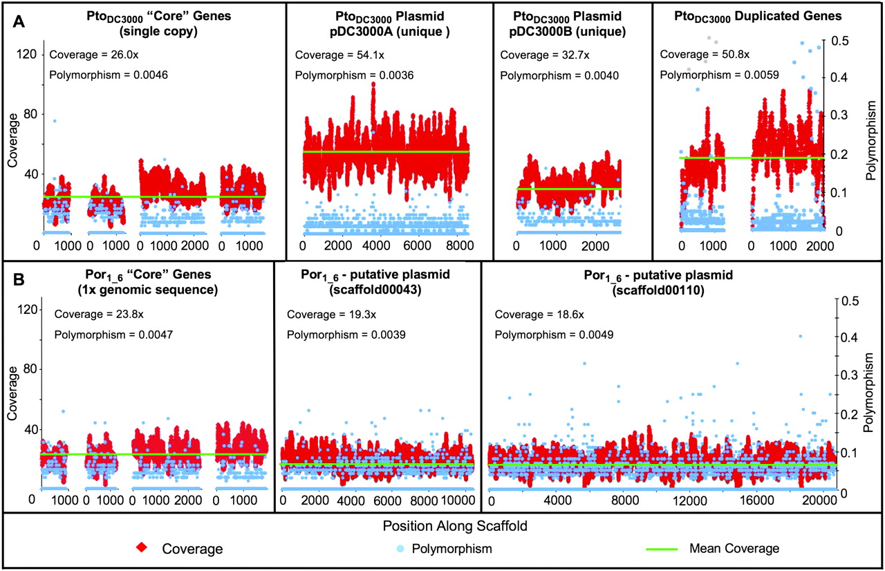 Por1_6 likely has an integrated plasmid. We surveyed all Por1_6 scaffolds for sequences similar to known P. syringae plasmid genes. Por1_6 scaffolds 34 and 110 showed significant levels of similarity to a known plasmid, pPSR1 (Sundin et al. 2004). Coverage levels within the raw reads were determined for these scaffolds as well as for unique portions of each PtoDC3000 plasmid and unique genomic regions from both Por1_6 and PtoDC3000. (red diamonds). Four single-copy chromosomal genes commonly used in MLST studies (rpoD, fruK, gyrB, gltA) were chosen from PtoDC3000 and Por1_6 as controls for chromosome-level coverage, and two duplicated genes (ilvA2 and PSPTO_0034) were randomly chosen as positive controls for duplicated regions. Coverage levels for sequences from both PtoDC3000 plasmids were consistently higher than those for the single-copy PtoDC3000 chromosomal sequences (A). Hence, there are multiple copies of each plasmid present within a cell relative to the chromosome. In contrast, the coverage levels of Por1_6 scaffolds 43 and 110 were very similar to that of the four control genes (B), implying that these regions are present on a very low copy number plasmid or have been integrated into the Por1_6 chromosome.