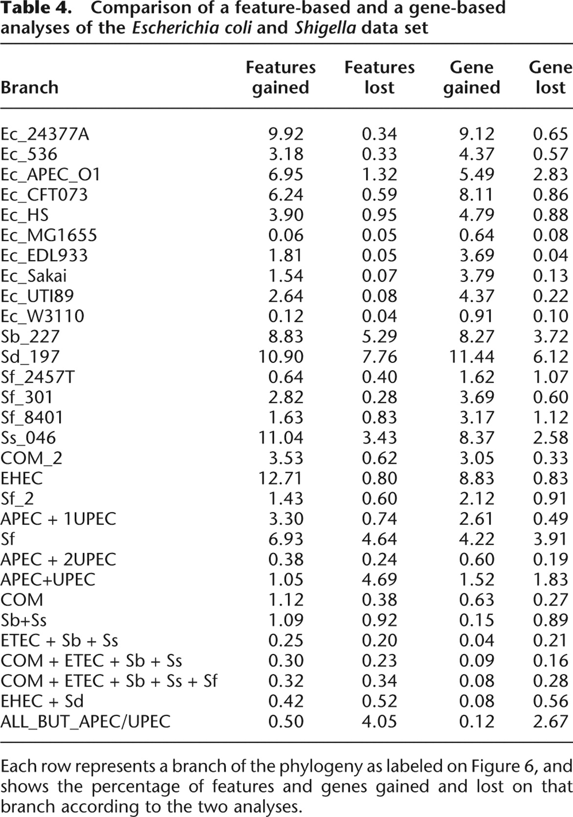 Each row represents a branch of the phylogeny as labeled on Figure 6, and shows the percentage of features and genes gained and lost on that branch according to the two analyses.