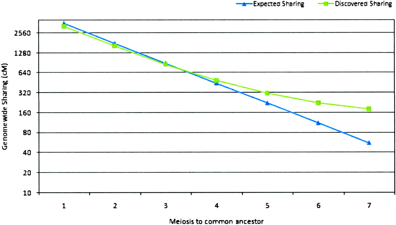 Expected and detected genome-wide sharing (Kosrae Cohort). (Blue, ▲) Expected genome-wide sharing; (green, ■) detected genome-wide sharing.