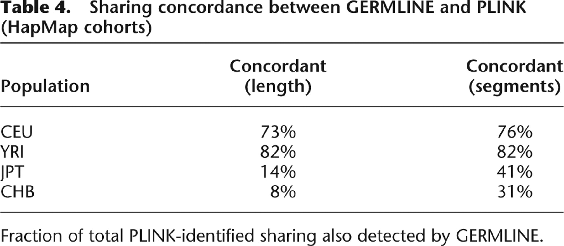 Sharing concordance between GERMLINE and PLINK (HapMap cohorts)