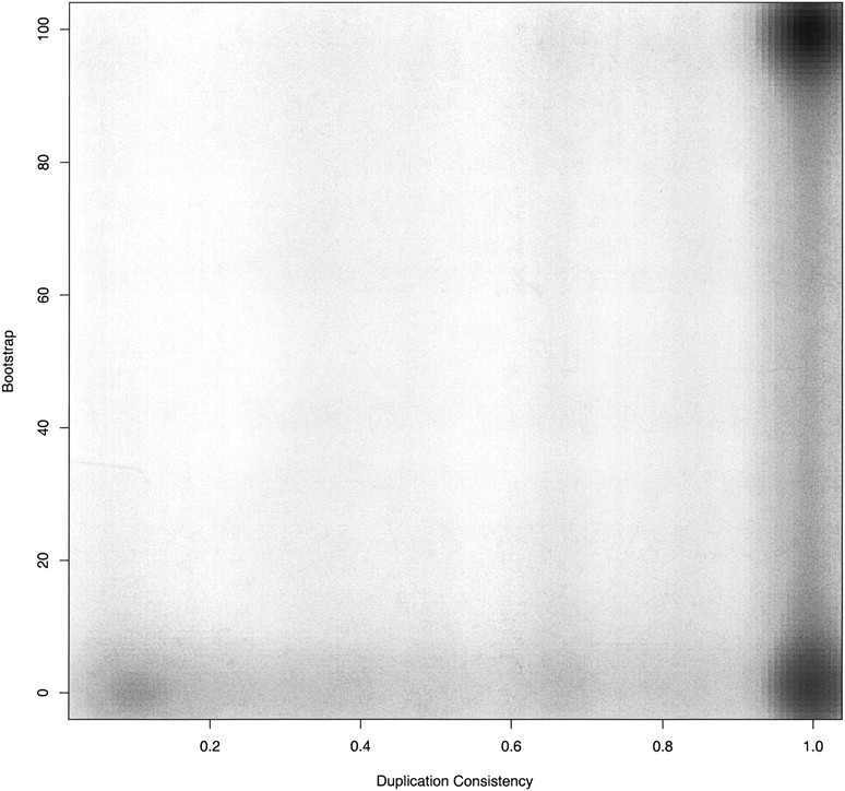 A scatter plot of the duplication consistency score (x-axis) compared to the bootstrap value of duplication nodes (y-axis). Because of the large number of values, the density of points is shown using the smoothScatter kernel-based density function in R.