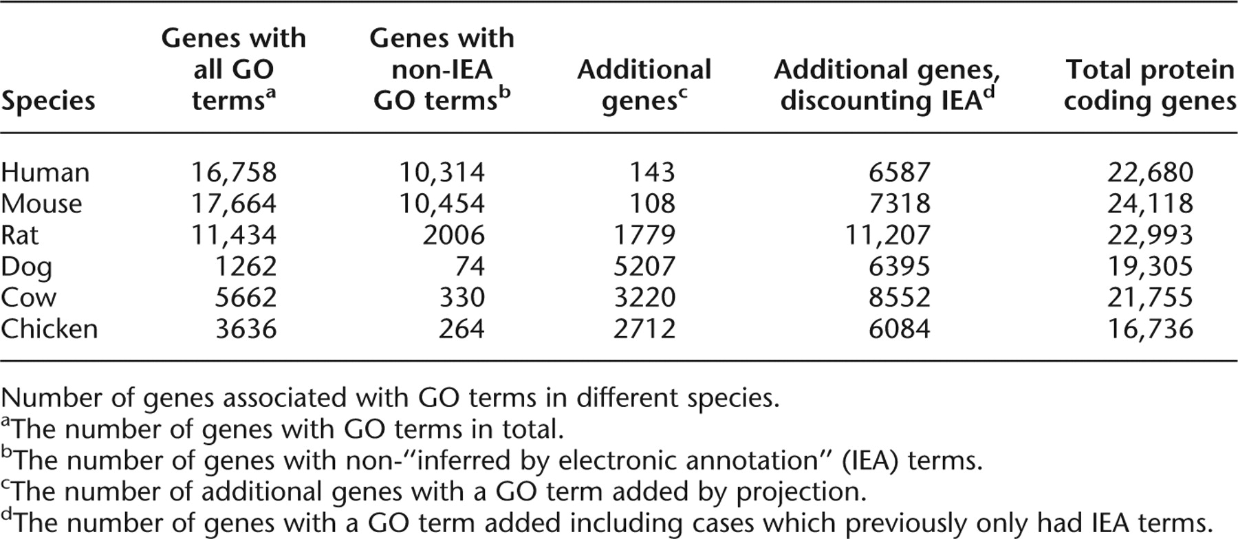dThe number of genes with a GO term added including cases which previously only had IEA terms.