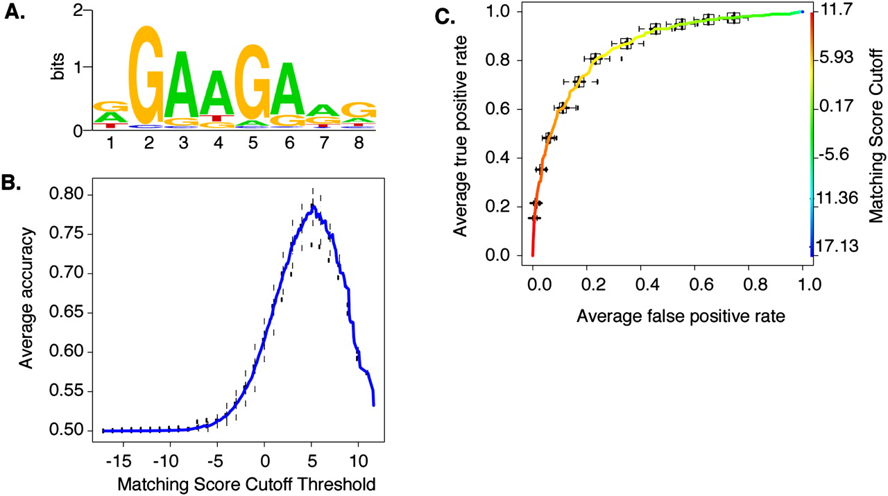 Modeling the in situ SFRS1 consensus-binding motif. (A) The MEME algorithm was used to identify a consensus motif from 300 amplicons selected at random from a total of 641 blocks common to three out of four CLIP-seq experiments. This calculation was repeated 20 times. The motif with the highest sensitivity and specificity (see C) is depicted here. The likelihood of finding this motif at random is <1 × 10−107. (B) The averaged Accuracy plot for each positional weight matrix calculated from the MEME results. The prediction accuracy of the SFRS1 site was plotted as a function of matching score cutoff threshold. Maximum accuracy (78%) was achieved at a cutoff score of 5.2. This calculation was repeated 40 times using the gold standard data set. Error bars correspond to the standard deviation from the mean accuracy. (C) The averaged receiver operator characteristic curve of the SFRS1 consensus site model. This plot evaluates the sensitivity (true positive rate of discovery) and specificity (false positive discovery rate) as functions of matching score cutoff threshold. The ROC evaluates the ability of the PWM to discriminate between positive (CLIP-seq derived) and negative components (55-bp fragments selected from intergenic deserts) of the gold standard data set. This calculation was repeated 40 times. Error bars correspond to standard deviation from the mean sensitivity and specificity.