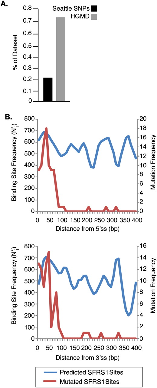 Disruption of SFRS1 binding sites can cause human inherited disease. (A) Single-nucleotide substitutions causing loss of predicted SFRS1 binding sites in the Human Gene Mutation Database (http://www.hgmd.org) and the SeattleSNPs database (http://pga.gs.washington.edu) were identified by scanning reference and mutated exon sequences with the SFRS1 PWM. The proportion of entries in each database giving rise to a loss of SFRS1 sites was then plotted, and a statistically significant difference between the HGMD and SeattleSNPs data sets observed (P < 10−5; Fisher's exact test). (B) Disease mutations resulting in the loss of SFRS1 binding sites were found to be largely confined to exon boundaries. The top and bottom panels plot mutated sites relative to the 5′ and 3′ splice sites, respectively. The blue line in each plot represents the distribution of SFRS1 binding sites throughout the HGMD exons. The red lines correspond to the distribution of sites ablated by disease-causing mutations. These data demonstrate that although binding sites for SFRS1 can be predicted across HGMD exons, disease mutations tend only to disrupt those SFRS1 binding sites that are in close proximity to splice sites.
