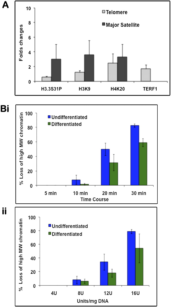 Chromatin immunoprecipitation (ChIP)/PCR analysis and MNase digestion assays. (A) ChIP was performed on undifferentiated and differentiated ES129.1 cells using anti-sera against TERF1, H3.3S31P, H4K20me3, and H3K9me3, followed by real-time PCR analysis using primers specific for telomere or pericentric major satellite DNA. Fold-differences in the enrichment of the ChIP/PCR products (n = 3) were presented as histograms. Following differentiation, H3.3S31P levels at the telomeres was only 0.54-fold (i.e., reduced by 46%) of those in undifferentiated cells, whereas H3K9me3 and H4K20me3 levels at the telomeres were increased by 1.2- and 2.5-fold, respectively. At the pericentric heterochromatin, the levels of H3.3S31P, H3K9me3 and H4K20me3 were increased by 3.0-, 3.6-, and 3.3-fold, respectively. Data for the analysis are shown in Supplemental Table 1. (B) MNase assays (n = 3) were performed on both undifferentiated (i) and differentiated (ii, 6 d) ES129.1 cells by MNase digestion over a time-course (i, 4 units MNase/mg DNA for 5 to 30 min at 37°C) and with various concentrations of MNase (ii, 4–16 units/mg DNA for 5 min at 37°C). Southern blot analysis was performed using radioactive-labeled telomere probe. Change in MNase sensitivity was quantitated by measuring the distance between nucleosomes with the highest and lowest molecular sizes (Gilbert et al. 2007). Results were presented as percentage of loss of high-molecular-weight (MW) chromatin. Telomeric chromatin in differentiated cells was less sensitive to MNase digestion. Examples of individual MNase/Southern analysis are shown in Supplemental Figure 9.