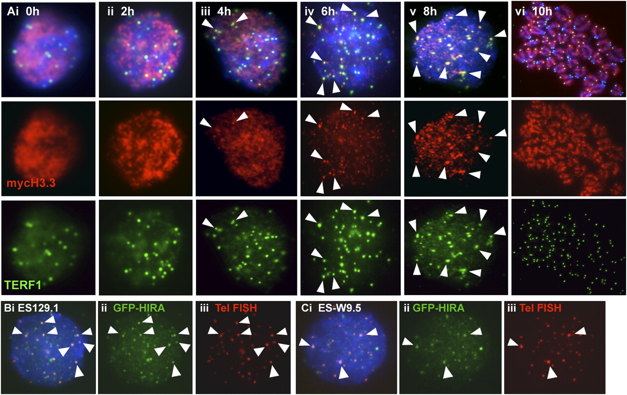 Immunofluorescence analysis of MYC-H3.3 telomeric loading and GFP-HIRA. (A) Immunofluorescence analysis of synchronized ES129.1 cells. MYC-H3.3 was induced by doxycycline. MYC-H3.3 (red) distribution was homogenous in cells 0–4 h post-release from thymidine-G1/S block. MYC-H3.3 was mostly loaded onto telomeres (indicated by colocalization with TERF1, green; indicated by arrowheads) after 6 h of release, and became even more apparent 8 h of release. MYC-H3.3 remained associated with the telomeres as cells entered metaphase after 10 h of release. (B,C) Immunofluorescence analysis of ES129.1 (B) and ES-W9.5 (C) cells 24 h post-transfection with N-terminal GFP-HIRA construct. Telomeric localization of GFP-HIRA (B,C, ii, green) was indicated by colocalization with telomere FISH signals (B,C, iii, red). Cellular localization of GFP-HIRA in differentiated cells is shown in Supplemental Figure 4E–G.