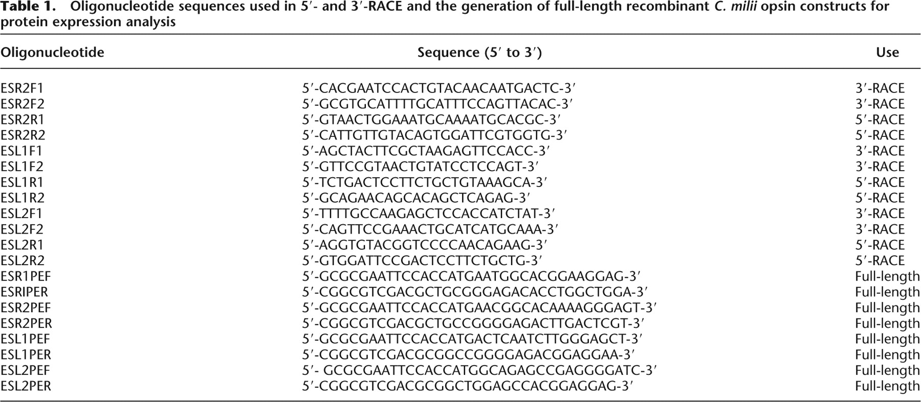 Oligonucleotide sequences used in 5′- and 3′-RACE and the generation of full-length recombinant C. milii opsin constructs for protein expression analysis