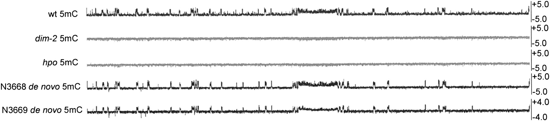 N. crassa performs efficient de novo methylation of heterochromatic regions. The distribution of 5mC is shown across LGVII for wild type (wt), the methylation deficient strains dim-2 and hpo, and wild-type daughter strains from two crosses between methylation deficient strains. Enrichment values for MeDIP experiments are shown as log2 values on the y-axis. The wild-type strain N3668 was obtained by crossing two strains that lack 5mC but retain H3K9me3, dim-2, and hpo. The wild-type strain N3669 was obtained by crossing two strains that lack both H3K9me3 and 5mC, dim-5, and dim-8. Thus, all methylation in these strains is a result of de novo methylation.