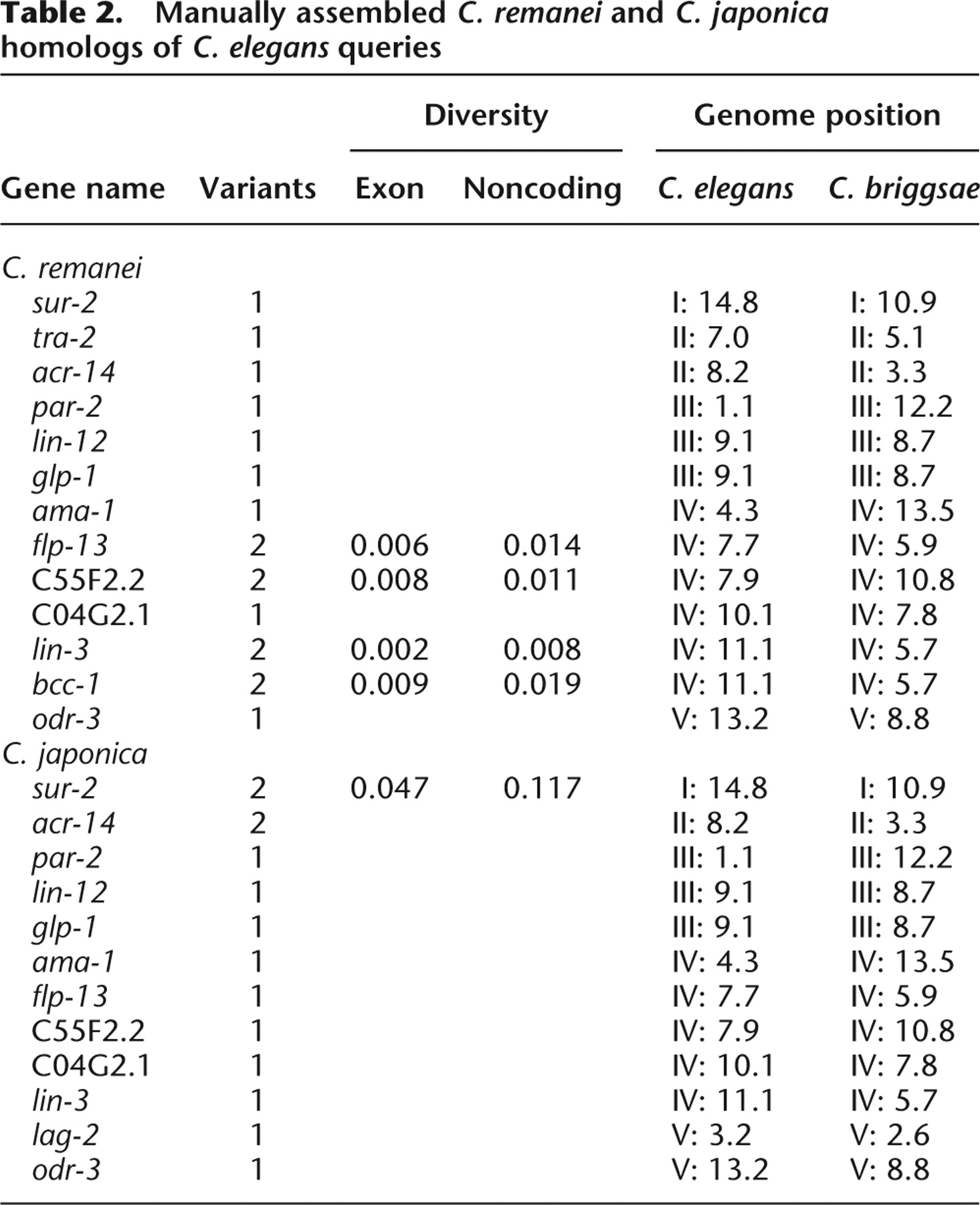 Manually assembled C. remanei and C. japonica homologs of C. elegans queries