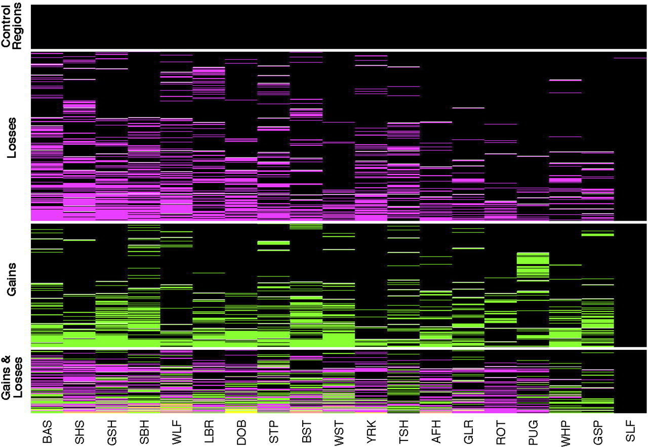 Heatmap representation of CNVs. Each row represents one of the 678 unique CNV regions and columns correspond to dogs. For each CNV region, boxes are colored as black, magenta, and green, depending on whether the individual showed no copy number variation, a loss, or a gain, respectively. CNV regions that show both a loss and a gain within an individual dog (see text) are colored yellow. Horizontal white lines separate CNV calls from single copy control regions, and CNVs that exhibit only losses, gains, or both gains and losses. Within each class, CNV regions are sorted from low to high frequency and from left to right dogs are sorted by decreasing number of CNVs. Dog breeds are abbreviated as follows: Basenji (BAS), Shetland Sheepdog (SHS), German Shepherd (GSH), Siberian Husky (SBH), Wolf (WLF), Labrador Retriever (LBR), Doberman Pinscher (DOB), Standard Poodle (STP), Belgian Shepherd Tervuren (BST), West Highland White Terrier (WST), Yorkshire Terrier (YRK), Boxer (Tasha) (TSH), Afghan Hound (AFH), Golden Retriever (GLR), Rottweiler (ROT), Pug (PUG), Whippet (WHP), German Short Haired Pointer (GSP), and Self-Self hybridization (SLF).