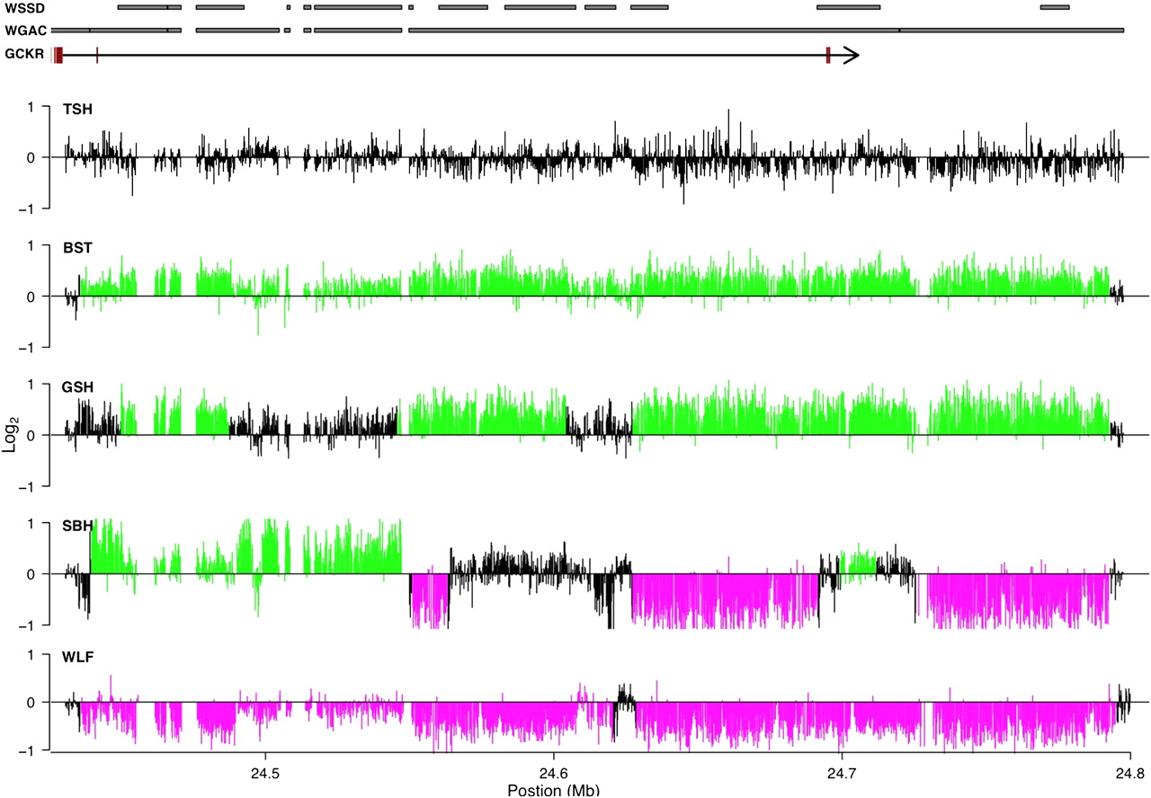Example of a complex CNV region. Distribution of log2 probe intensities across a 400-kb region of chromosome 17 that shows substantial variation in breakpoints across individuals and spatial heterogeneity of copy number within individuals. Black, green, and magenta indicate regions called as no copy number variation, gains, and losses, respectively. The gene structure of GCKR is shown, with black lines and red boxes corresponding to introns and exons, respectively. For clarity, additional RefSeq genes are not shown. Regions with significant WGAC or WSSD scores are indicated by gray rectangles. Breeds are abbreviated as described in Figure 3.
