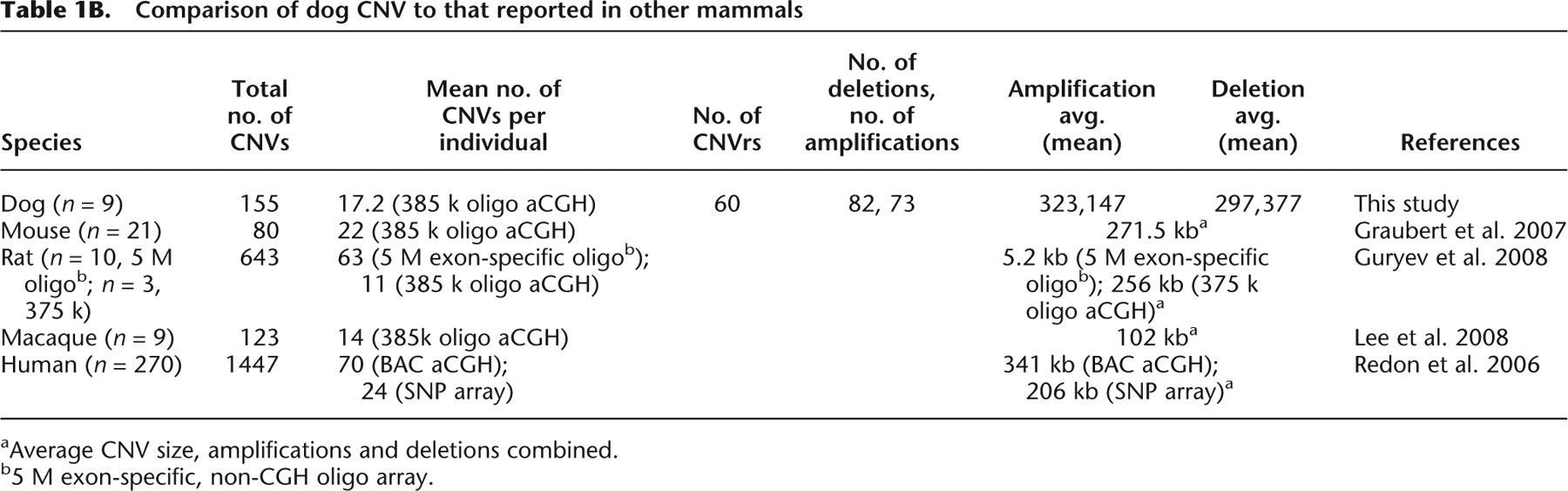 Comparison of dog CNV to that reported in other mammals