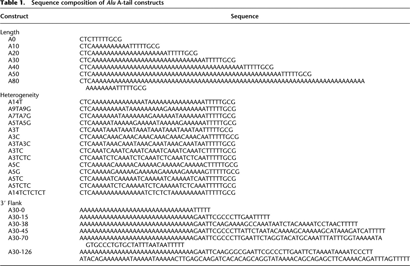 Sequence composition of Alu A-tail constructs