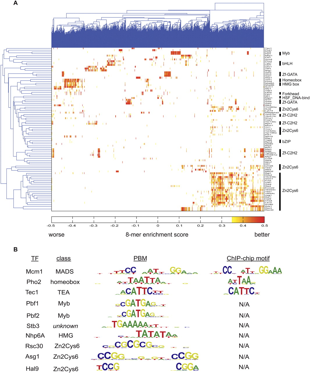 PBM characterization of S. cerevisiae TF DNA-binding specificities. (A) Hierarchical clustering of PBM data over ungapped 8-mer E-scores determined for 89 yeast TFs. (B) Sequence logos for selected examples of newly discovered yeast TF DNA-binding site motifs.