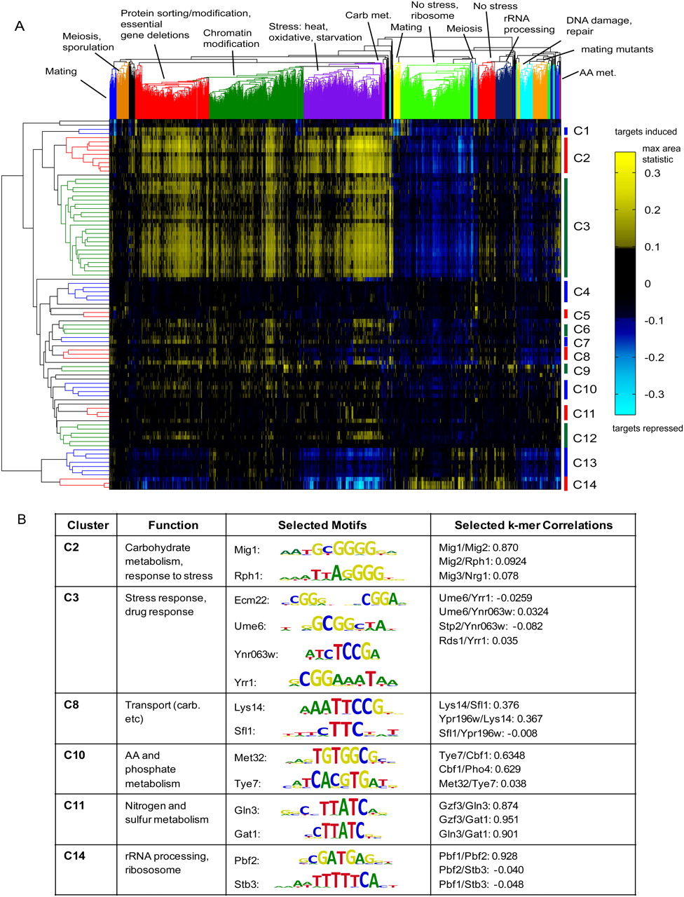 Analysis of TFs' regulatory associations and coregulatory factors. (A) Two-dimensional hierarchical clustering of 89 TFs (rows) according to their CRACR statistics across 1693 expression conditions (columns). (B) Examples of predicted coregulatory TFs from A with distinct motifs, and their 8-mer binding profile correlations. Clusters annotations are derived from the literature and functional predictions from this study. A high-resolution heatmap with full labeling is available in Supplemental Fig. S11, S12.