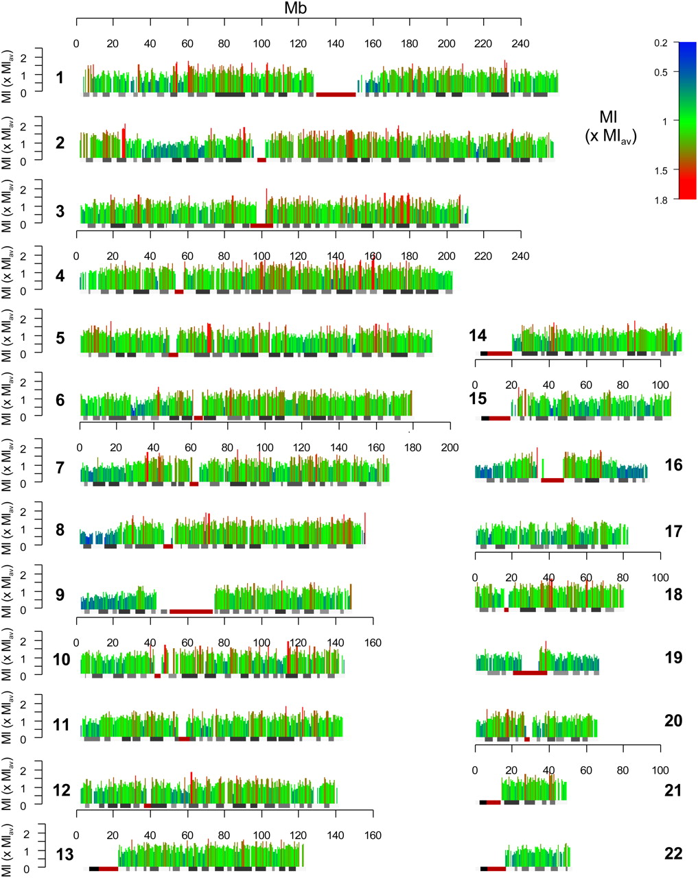 A genome-wide map of human germline methylation. A methylation index (MI) was calculated for each 500 kb of genomic sequence with satisfactory data (no gaps in sequencing and at least 20 known SNPs). The y-axis value and bar color (see color index) demonstrate methylation as the ratio of average genome MI (MIav).