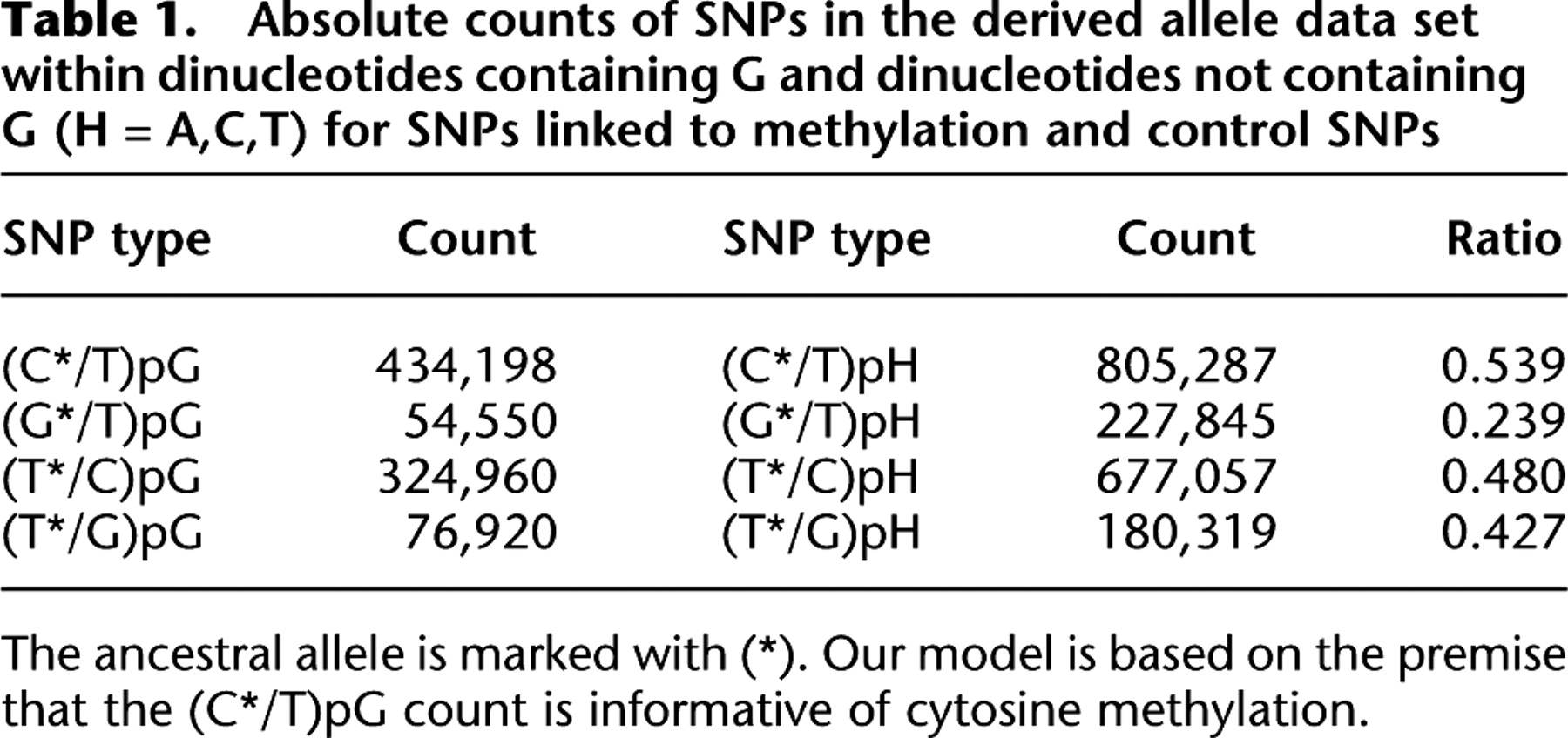 The ancestral allele is marked with (*). Our model is based on the premise that the (C*/T)pG count is informative of cytosine methylation.
