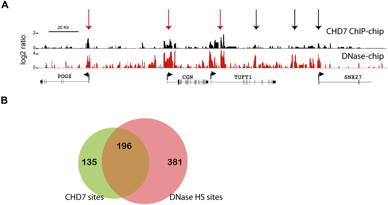 CHD7 overlaps with a subset of regions known to harbor regulatory elements. (A) Regulatory elements were mapped using the approach of DNase-chip (red), and compared to CHD7 sites mapped by ChIP-chip (black). Median smoothed raw ratio data are displayed. Note that most of the CHD7 binding sites are contained within DNase I hypersensitive sites (red arrows), but not vice-versa (black arrows). (B) Venn diagram depicting the overlap between high confidence (P ≤ 1 × 10−12) CHD7 (green) and DNase-HS sites (pink) across the ENCODE regions.