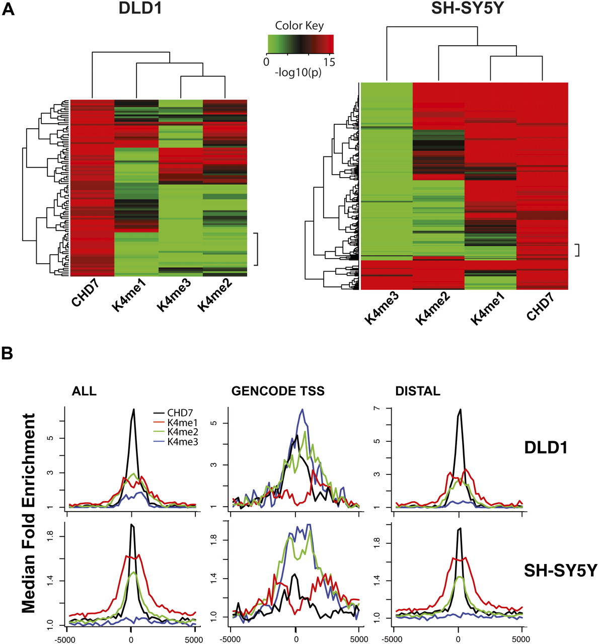 Comparison of CHD7 and H3K4 methylation patterns. (A) Heat maps illustrating the overlap of CHD7 and K4 mono-, di-, and trimethylation across 6 ENCODE regions (left) in DLD1 cells and all 44 ENCODE regions in SH-SY5Y cells (right), respectively. The regions denoted by the side brackets harbor low levels of H3K4me1 that are apparent at lower significance thresholds. (B) Aggregate plots of ChIP-chip signals. Raw ChIP-chip data from each cell line were quantile normalized. The median signal intensity of CHD7 peaks (from −5 to +5 kb with respect to the center of the peak) was then calculated and plotted, along with signal intensities for mono-, di-, and trimethyl K4 at the equivalent regions in both DLD1 (top left) and SH-SY5Y cells (bottom left). This was repeated for CHD7 sites located at GENCODE transcription start sites (center) and distal CHD7 sites (right).