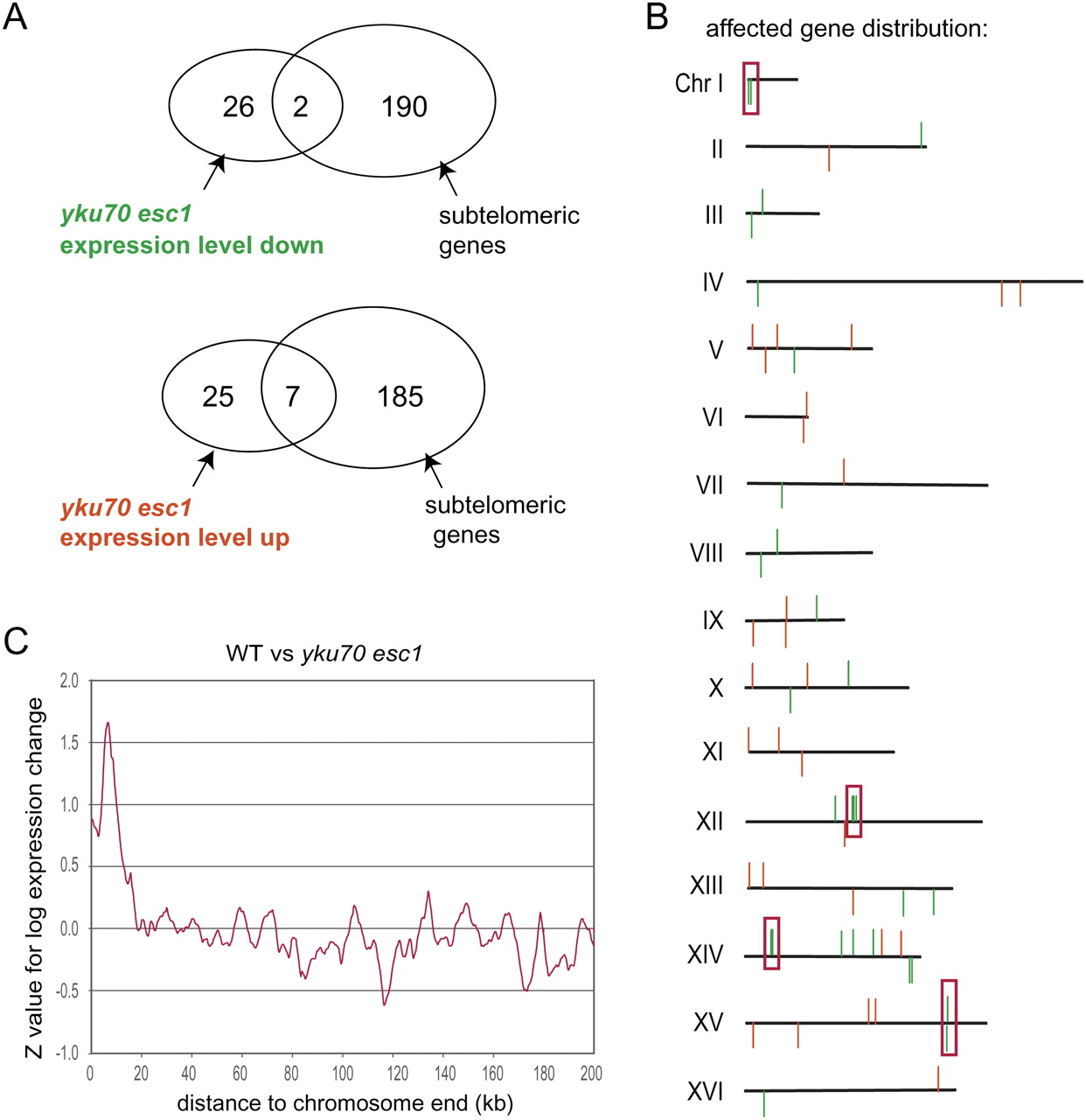 Deleting telomere anchoring pathways induces subtelomeric gene activation and misregulation of some internal genes. (A) Genes up-regulated in a yku70 esc1 (GA-2768) strain overlapped significantly with subtelomeric genes (defined as located <20 kb away from a telomere, P = 10−5). Genes down-regulated in yku70 esc1 did not overlap significantly with subtelomeric genes (P = 0.1). (B) The chromosomal position of all genes whose expression increased (red) or decreased (green) >1.5-fold between wild-type and yku70 esc1 strains is shown. Boxes indicate clusters of regulated genes. (C) Significance of expression changes as a function of distance to chromosome end. For each gene, a significance (Z-value) for its expression change in the yku70 esc1 mutant was calculated and the figure shows average Z-values as a function from distance to the nearest chromosome end. Positive values indicate up-regulation and negative values down-regulation.