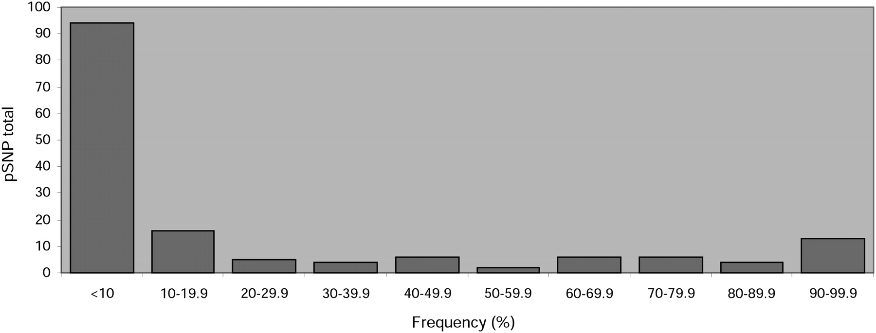 Distribution plot of rDNA pSNP frequency (occupancy ratio) values grouped in bins of 10% increments.