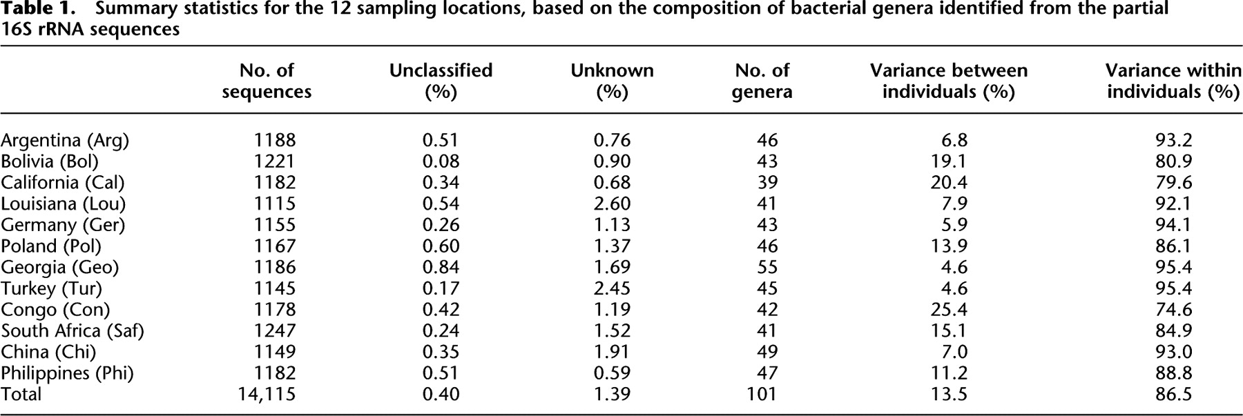 Summary statistics for the 12 sampling locations, based on the composition of bacterial genera identified from the partial 16S rRNA sequences