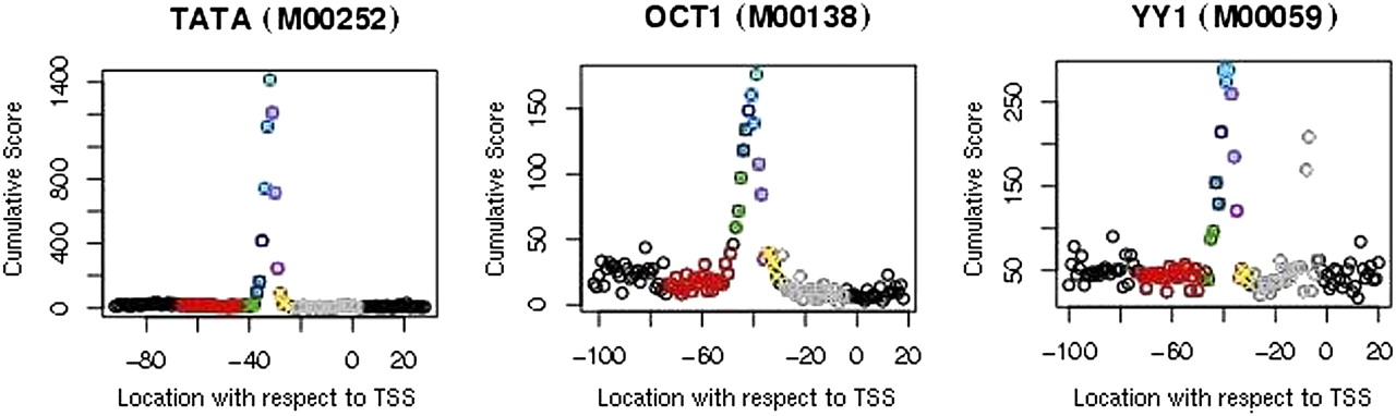 Regions of positional enrichment with respect to TSS for TF-binding elements TATA, OCT1, and YY1. TRANSFAC ID for each binding element is displayed in plot titles. Plots display cumulative score (summed over the annotation-supported training set TSS regions) for each element as a function of position with respect to TSS. Colors show the region subdivisions diagrammed in Figure 3A. (Red and gray) Flanking regions.