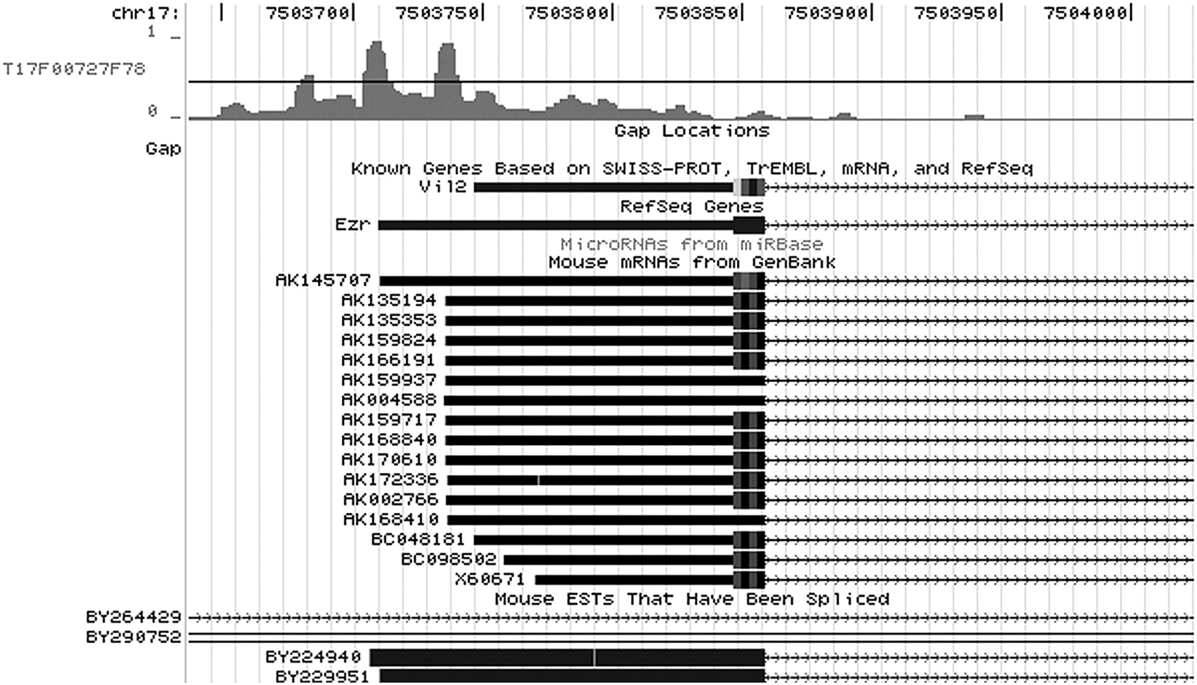 At the top, the UCSC custom track displays probability output from a representative scan over the region of a test set TSS using the annotation-supported model (this particular example shows CAGE tag cluster T17F00727F78). The model calls out highly probable single-peak start regions with surprising accuracy, often indicating additional possible single-peak starts in locations that are supported by mRNA transcripts from GenBank.