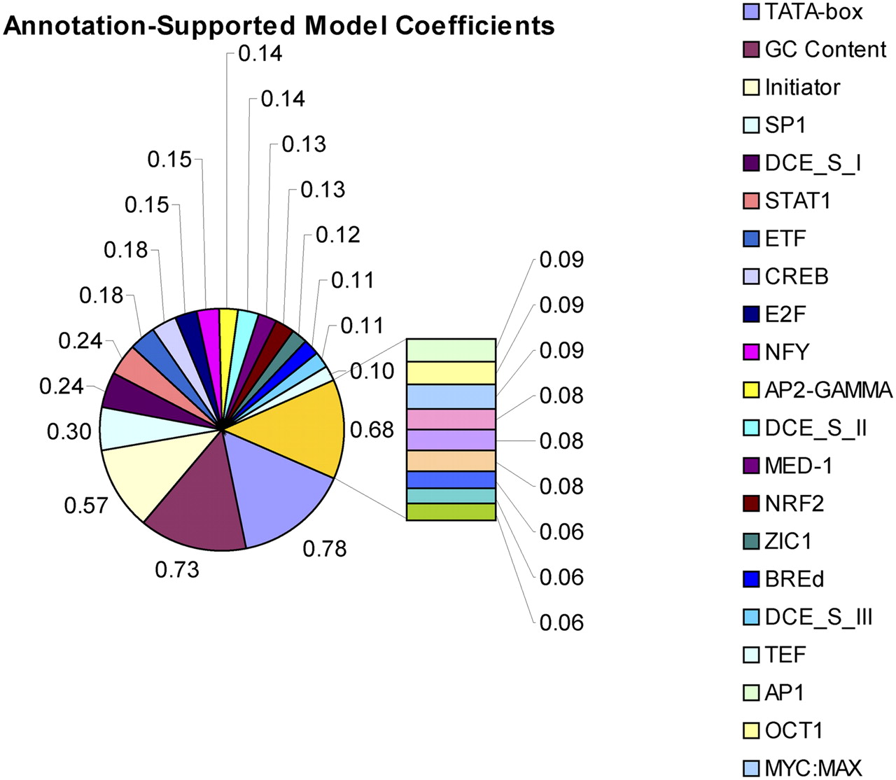 Logistic regression coefficients above 0.05 for the annotation-supported model. TATA-box, GC content within a 100-nt region, and Initiator elements are dominant, but highly accurate performance relies heavily on many other TFs. A complete listing of all factors and binding element abbreviations is provided in the Supplemental material.