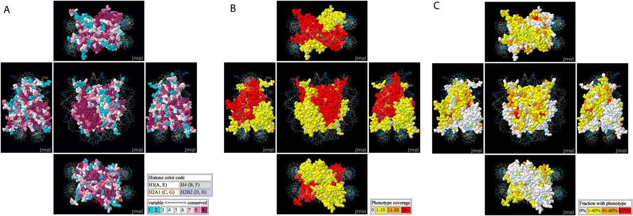 A nucleosome crystal structure is colored according to evolutionary conservation scores (A), number of mutant/assay combinations tested (B), and the fraction of mutant/assay combinations giving a non-wild-type phenotype (C).