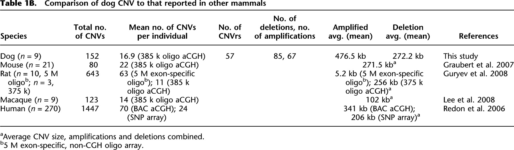 Comparison of dog CNV to that reported in other mammals