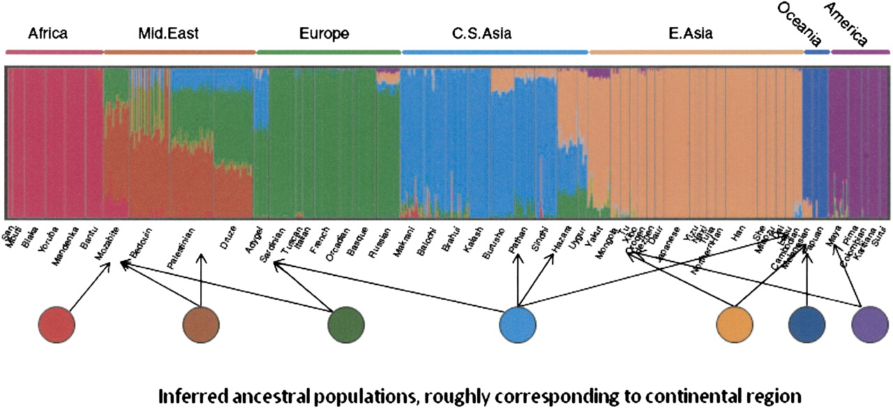 Admixture structure analysis of a worldwide sample. The x-axis represents individuals from populations arrayed geographically roughly from west to east, as labeled above with sample sources identified below. There is a thin vertical bar for each individual, color-coded to represent his/her admixture proportions from “parental” populations. The parentals are shown schematically as circles below the diagram, with arrows indicating a few of their contributions to individuals in the sample (circles and arrows added by us for this paper). These parental representations are not part of the actual sample but are statistically abstracted from it, as if they actually exist (some individuals in some of the populations are statistically assigned 100% ancestry from one of the parental in this particular data set). This analysis was done using the structure-like program Frappe (that employs a different estimation procedure for similar objectives; Tang et al. 2005). Structure analysis figure reprinted with permission from Li et al. 2008, American Association for the Advancement of Science © 2008.