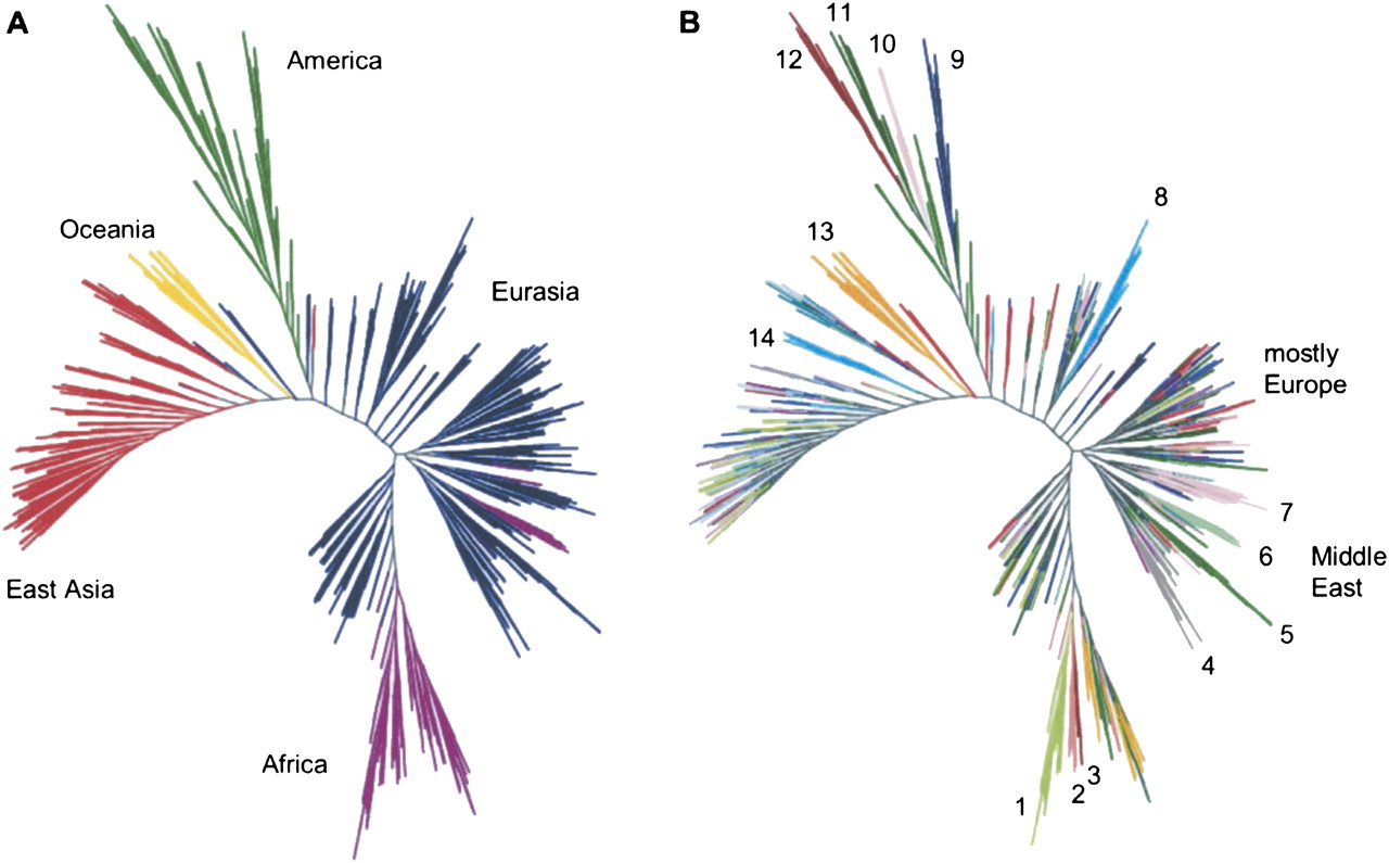 Illusions can be generated by population-based structure analysis. Individual genotype relationships from the CEPH-diversity 51 global population samples; neighbor-joining similarity trees were constructed from the matrix of pairwise differences (reprinted from Nievergelt et al. 2007). Panel A color codes the major world regions. The analysis correctly grouped individuals on this broad criterion. However, in panel B, the color code identifies the population source (number and text annotation represents different populations), showing intermingling of similarity within geographic regions. For details see the original paper (Nievergelt et al. 2007).