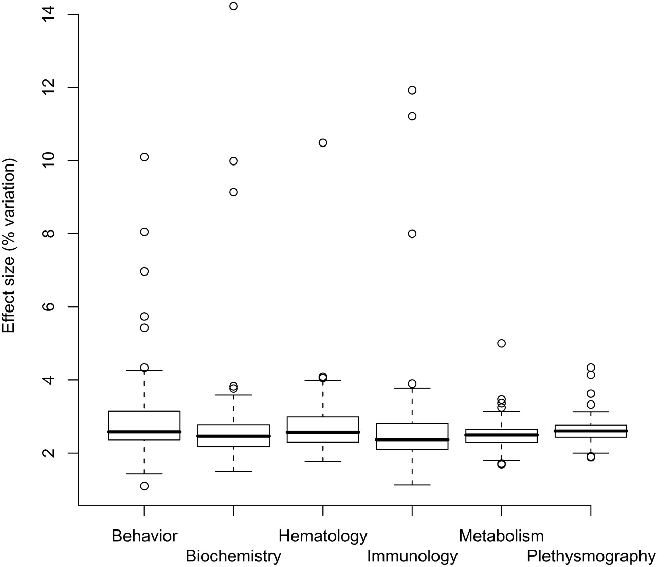 Effect sizes (expressed as percentage of total variation explained) for six categories of phenotype. Data are taken from analyses of 97 phenotypes mapped in heterogeneous stock mice (Valdar et al. 2006a).