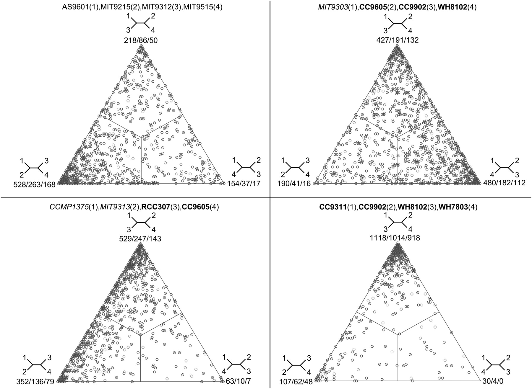 Phylogenetic relationships among selected genomes in the Prochlorococcus marinus/marine Synechococcus group. Each point in a triangle (simplex) represents a set of orthologous genes that contains at least four analyzed genomes (and as many as 19 genomes from this group). Position of the point in the barycentric coordinate system (triangle) depends on bootstrap support values for each of three possible tree topologies with which each vertex is associated. The closer the point to the vertex, the higher its bootstrap support for that tree topology. Poorly resolved relationships result in points located closer to the center of the triangle. Values at each vertex refer to the number of sets of orthologous genes that support the tree topology at the vertex overall, with at least 80% and at least 90% bootstrap support, respectively. For a full description of the methodology used to analyze embedded quartets, see Zhaxybayeva and Gogarten (2003) and Zhaxybayeva et al. (2006). Genomes are designated by their strain names. (Bold) Genomes of marine Synechococcus spp., (italics) low-light adapted Prochlorococcus marinus genomes, (plain font) Prochlorococcus marinus high-light adapted strains (all genomes are from NCBI's RefSeq database). Full analyses of the phylogenetic relationships within this group as well as details on the selection of sets of orthologous genes and phylogenetic analyses performed will be presented elsewhere (O. Zhaxybayeva, F. Doolittle, T. Papke, and P. Gogarten, in prep.).
