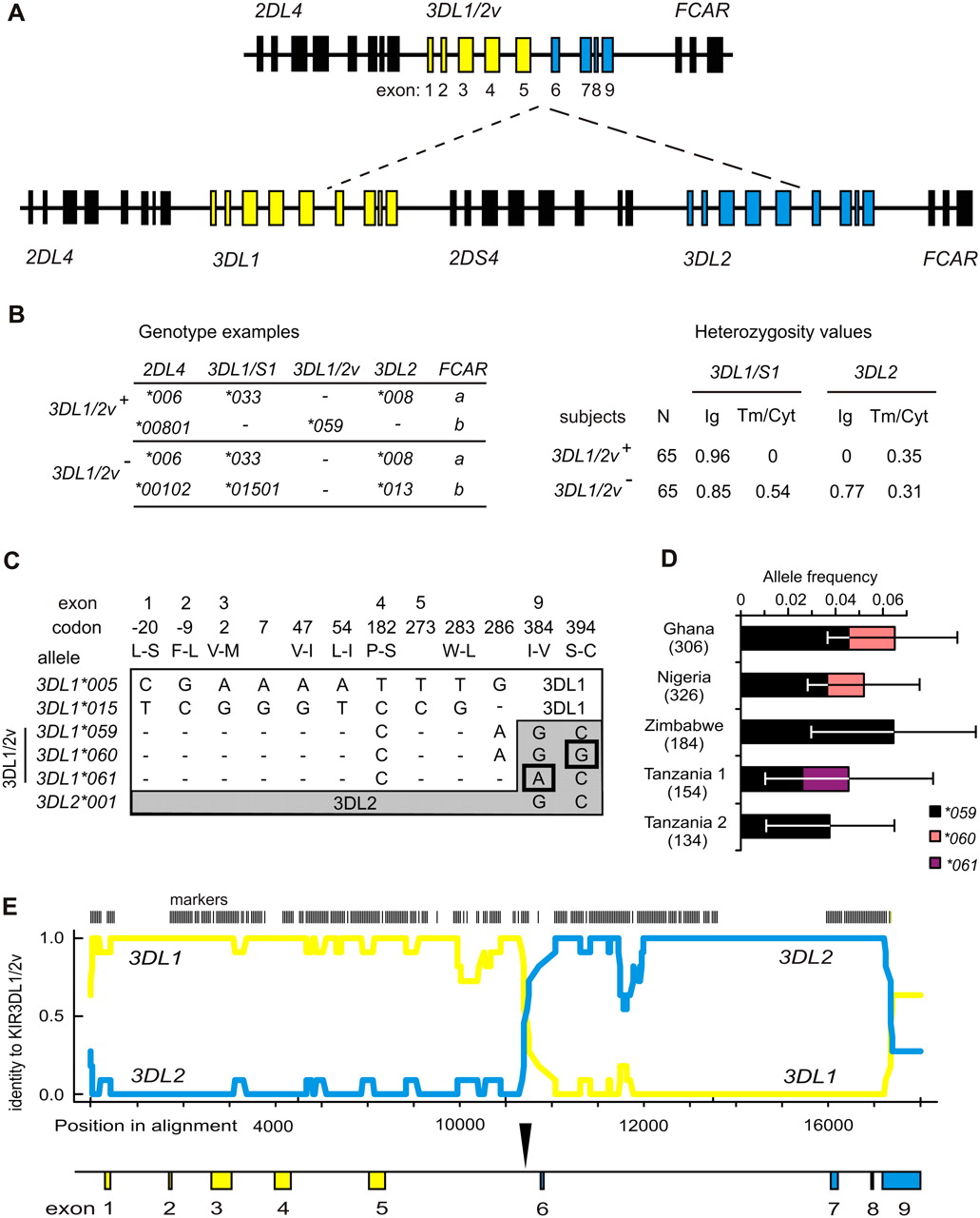 The 3DL1/2v fusion gene is allelic to 3DL1/S1 and 3DL2. (A, top) Schematic of the four 3DL1/2v haplotypes that were sequenced here (Supplemental Fig. S2). (Bottom) A KIR A haplotype; (dashed lines) the genomic segment absent from 3DL1/2v haplotypes; (yellow) 3DL1; (blue) 3DL2. Exons 1–5 encode the leader peptide and Ig domains (Ig), exon 6 the stalk, and exons 7–9 the transmembrane and cytoplasmic domains (Tm/Cyt). (B, left) Representative genotypes from the group of 65 subjects who carry 3DL1/2v (3DL1/2v+) and the group of 65 who do not (3DL1/2v−). (Right) Comparisons of heterozygosity observed in the 3DL1/2v+ and 3DL1/2v− groups from segments of 3DL1 and 3DL2. All of the 3DL1/2v+ subjects are hemizygous for exons 6–9 of 3DL1/S1 and exons 1–5 of 3DL2, which corresponds to the portion absent from the KIR A haplotype. This shows the 3DL1/2v+ subjects have 3DL1 and 3DL2 on one haplotype and 3DL1/2v on the other. (C) Shown are the nucleotide differences in exons 1–5 that distinguish 3DL1/2v (3DL1*059, 3DL1*060, and 3DL1*061) from (white) 3DL1 and in exons 7–9 that distinguish 3DL1/2v from (gray) 3DL2. The many nucleotide differences (N = 102) that distinguish 3DL1 and 3DL2 are not shown. Shown are 3DL1*00501 and 3DL1*01502, which represent the 005 and 015 lineages of inhibitory receptors; exons 1–5 of 3DL1/2v are related to 3DL1*00501. In exons 7–9, 3DL1*059 is identical to 3DL2*001; 3DL1*060 and 3DL1*061 being distinguished by the SNPs boxed. Codons are numbered according to the mature protein, and amino acid changes are indicated by single letter code. (D) Shown are the frequencies of three 3DL1/2v alleles (3DL1*059–61) in the five sub-Saharan African populations where they were detected. The number of haplotypes examined from each population is shown in parentheses; error bars show the 95% confidence interval of the allele frequency measurements. (E) Shown is a pairwise identity plot from alignment of genomic sequences. (Yellow line) Signifies identity of 3DL1/2v with 3DL1; (blue line) the identity of 3DL1/2v with 3DL2; (vertical bars) the SNP markers used in this analysis. (Shown below by the vertical arrow) The crossover occurred in intron 5 during the interval from 386 to 356 bp upstream from exon 6. A continuous sequence trace that spans the crossover is shown in Supplemental Figure S2.