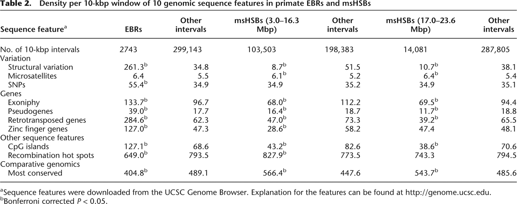 Density per 10-kbp window of 10 genomic sequence features in primate EBRs and msHSBs