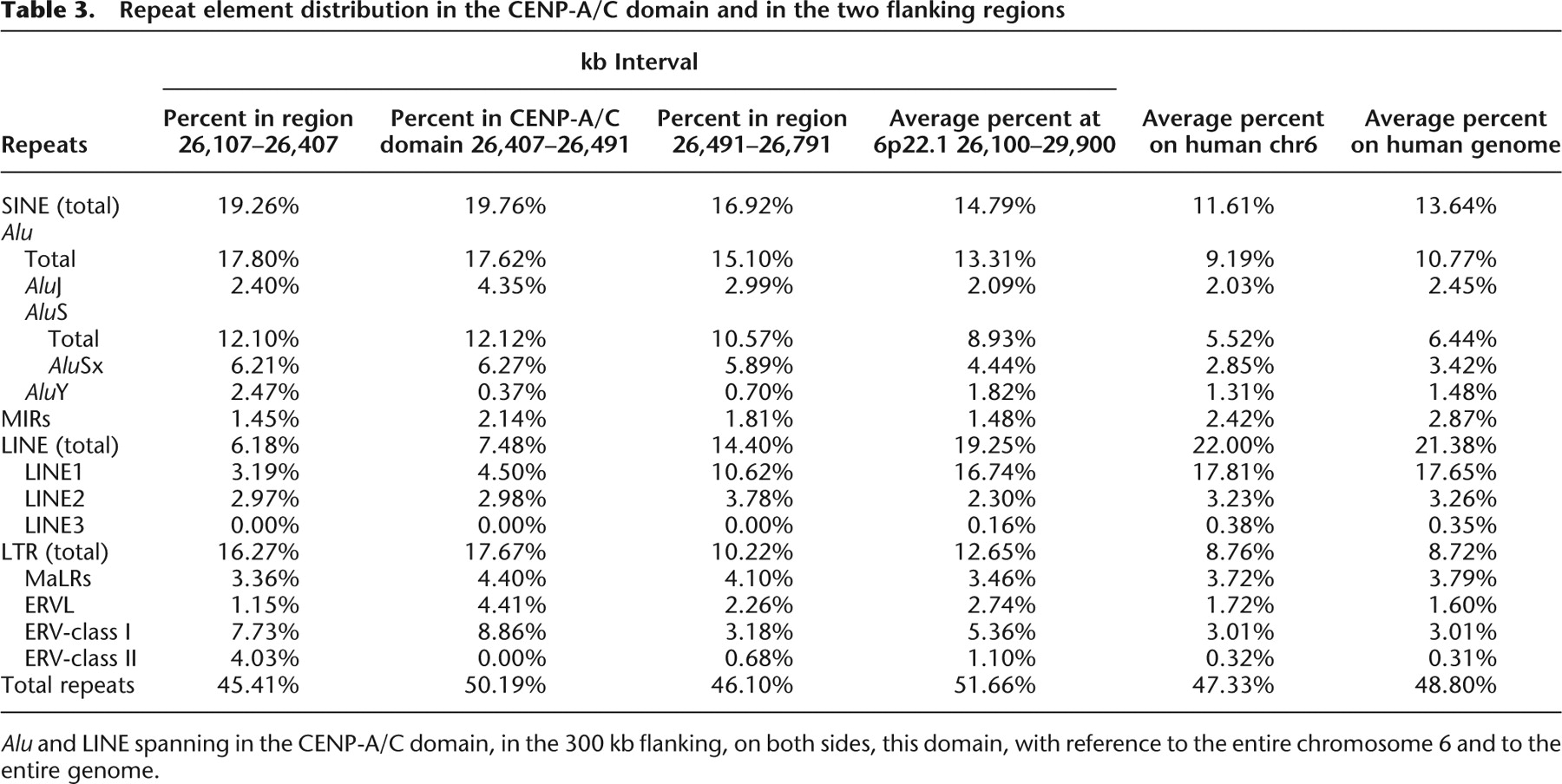 Alu and LINE spanning in the CENP-A/C domain, in the 300 kb flanking, on both sides, this domain, with reference to the entire chromosome 6 and to the entire genome.