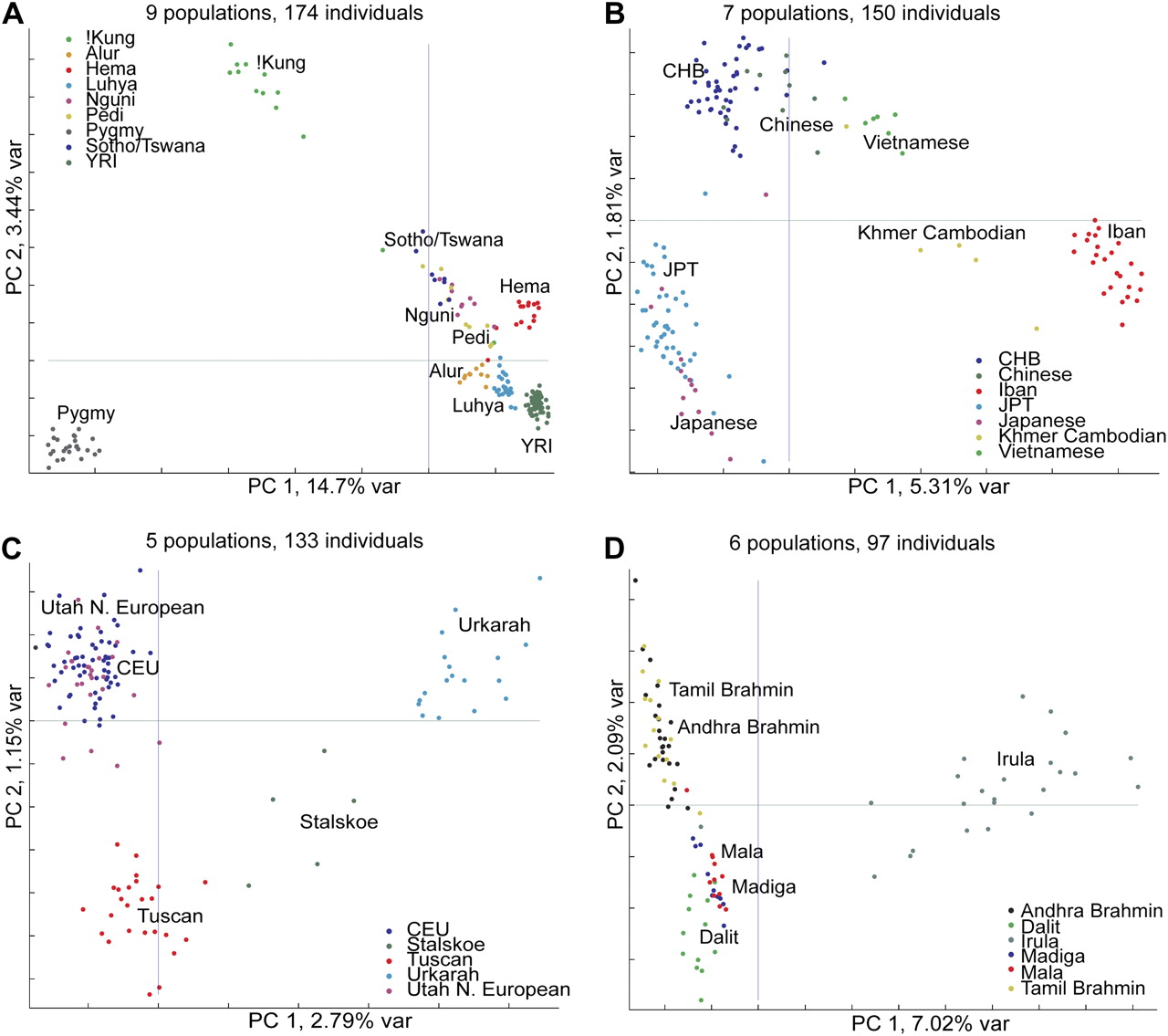 Principal components analysis of population structure in each continental group. (A) Africa, (B) East/Southeast Asia, (C) Europe, and (D) India. First two PCs are shown. Each individual is represented by one dot and the color label corresponding to their self-reported population origin. The percentage of variation explained by each PC is shown on the axes.