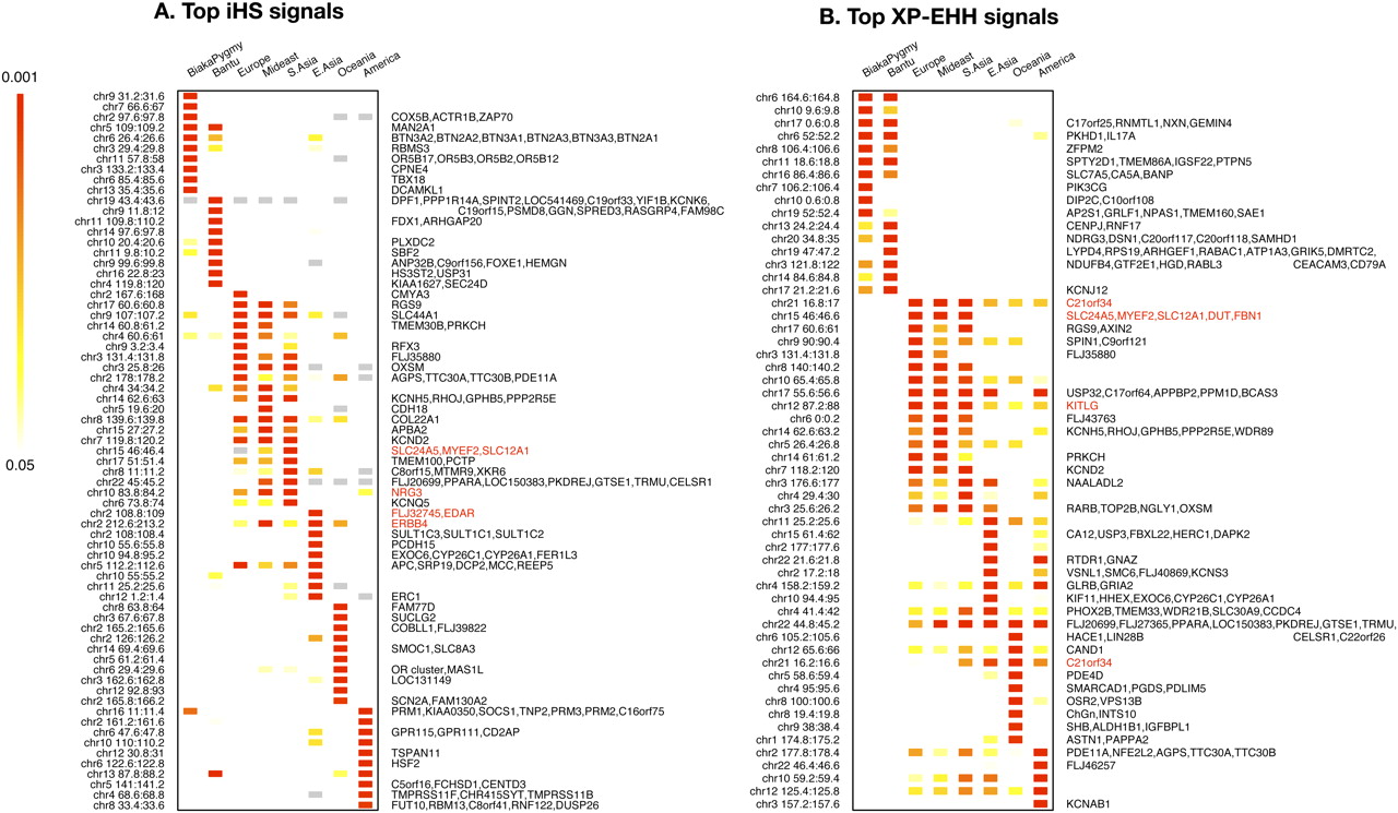 Top 10 iHS (A) and XP-EHH (B) signals by population cluster. Each row is a 200-kb genomic window, each column is a geographic region, and each cell is colored according to the position of the window in the empirical distribution of scores for that region. Plotted are the most extreme 10 windows for each geographic region. Gray cells in A are windows that have fewer than 20 SNPs for which iHS was calculated (see Methods). To the right of each row is a list of genes that fall in the window. Windows where the genes are in red are discussed in the text. Note that interpretation of the overlap in XP-EHH signals is complicated by the need for a reference population; see the main text.