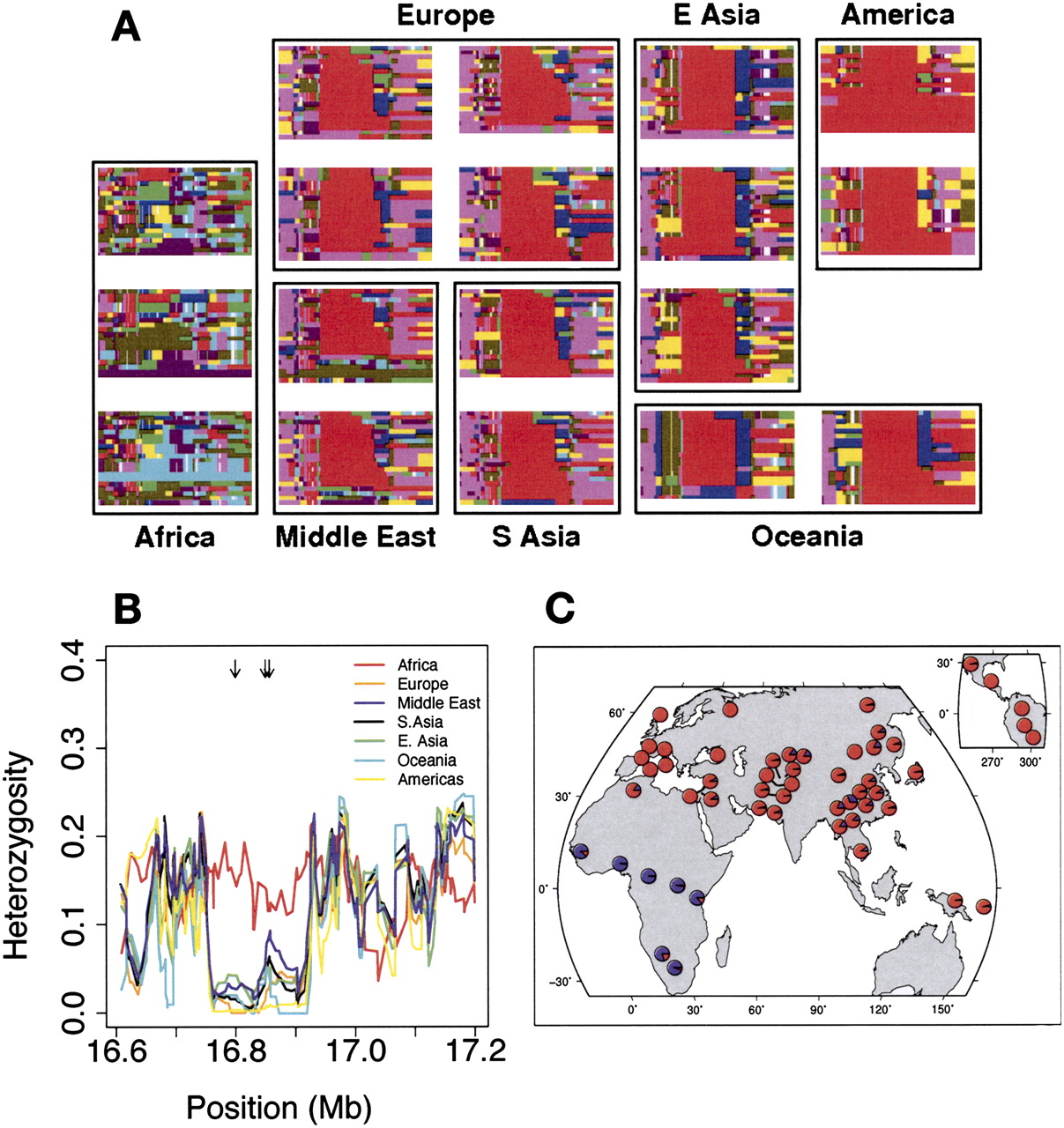 Evidence for selection in a region containing part of the gene C21orf34. (A) Haplotype plots in a 500-kb region on chromosome 21 surrounding the locus. Each row represents a haplotype, and each column a SNP. Rows are colored the same if and only if the underlying sequence is identical (some low-frequency SNPs are excluded). For full details on the generation of these plots, see Conrad et al. (2006). (B) Heterozygosity in the same region. Lines show heterozygosity calculated in a sliding window of three SNPs across the region in different populations. Black arrows at the top of the plot represent the positions of SNPs with FST > 0.6 (i.e., in the 0.01% tail of worldwide FST). (C). A pie chart of the worldwide distribution of a SNP that tags the red haplotype in A (rs2823850). (Red) The derived allele frequency; (blue) the ancestral allele frequency.