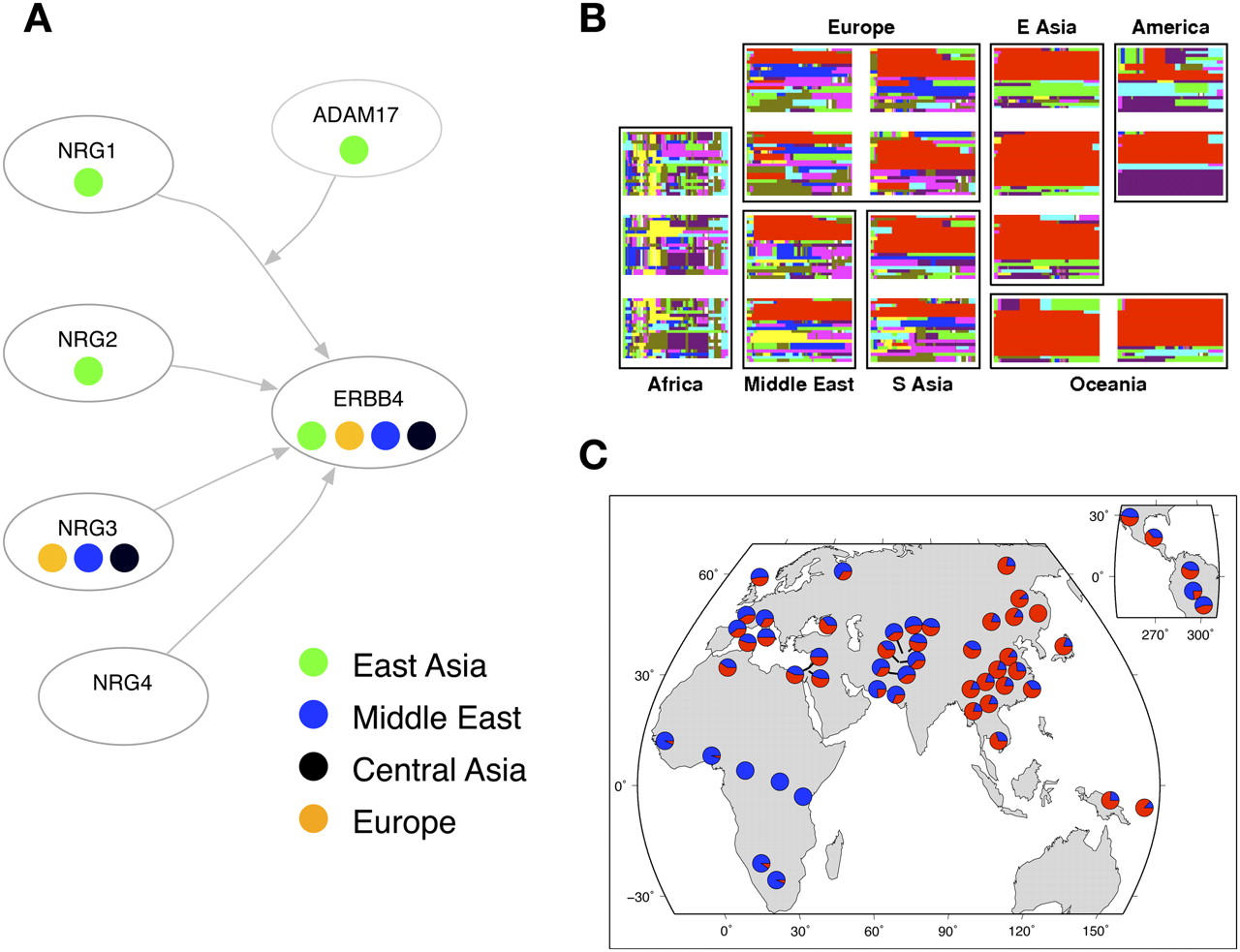 Selection signals in the NRG–ERBB4 pathway. (A) A schematic of the NRG–ERBB4 pathway, drawn from interactions reported in KEGG (Kanehisa et al. 2008) and Mei and Xiong (2008). Each oval represents a gene, and the colored circles denote the geographic regions that have significant selection signals (empirical scores in the top 5% of the distribution). We excluded Oceania and the Americas from this plot since selection scans are expected to have low power in these regions. For ADAM17, the selection statistic is XP-EHH; for the others it is iHS. (B) Haplotype plots at the putative selected region in ERBB4. (C) Worldwide allele frequencies of a SNP that tags the red haplotype in B (rs1505353). (Red) The derived allele; (blue) the ancestral allele.