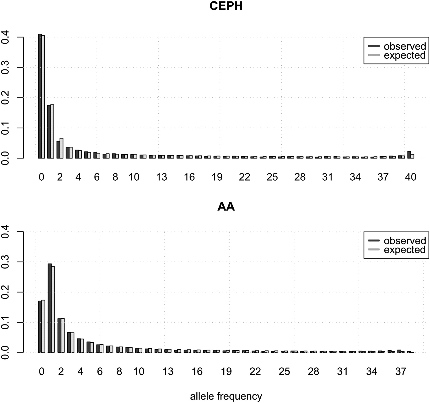 The unfolded marginal frequency spectra predicted from the best-fitting model (simulated) and the observed marginal frequency for European-Americans (top) and African-Americans (bottom) from the autosomal data. The zero category represents SNPs that are absent from one population but present in the other.