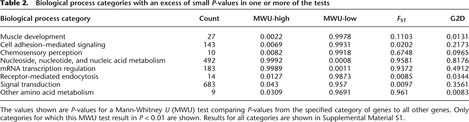 The values shown are P-values for a Mann-Whitney U (MWU) test comparing P-values from the specified category of genes to all other genes. Only categories for which this MWU test result in P < 0.01 are shown. Results for all categories are shown in Supplemental Material S1.